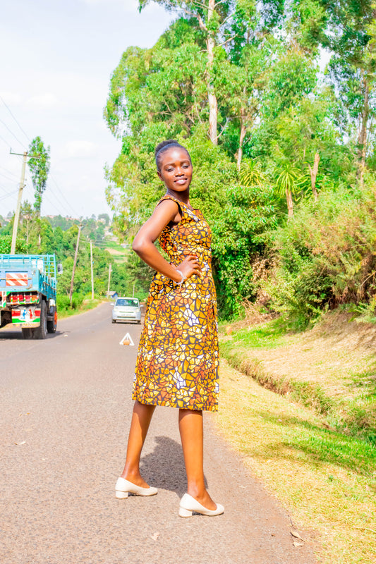 Regular price KSh5,370.00Regular priceUnit price / perSale price KSh5,370.00Sheath dress - Brown, orange, gold, bronze and white prints motif