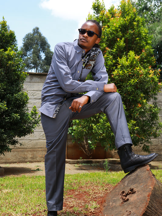 Casual Smart 2 Piece - Grey with African prints contrast on thre left side of shirt