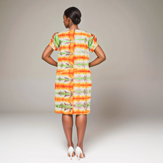 Sheath-Brown, orange, cream circles. Off-shoulders