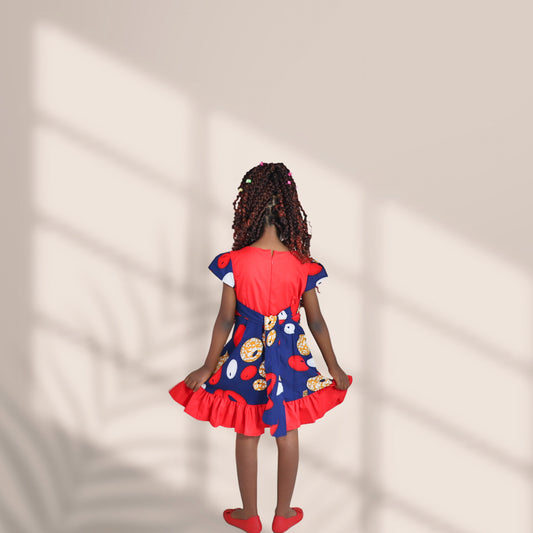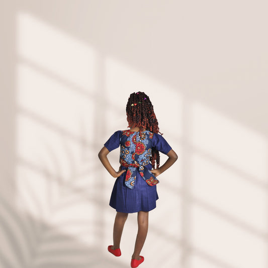 Kinder-Navy blue red and brown floral motif and blue skirt: