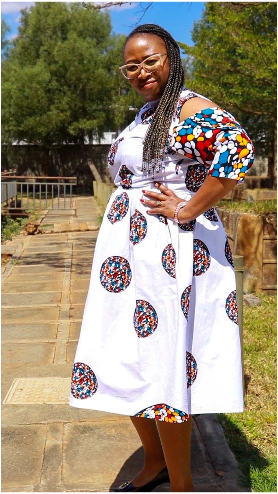 A-Line - White, circles and dots of white ,orange maroon and blue.