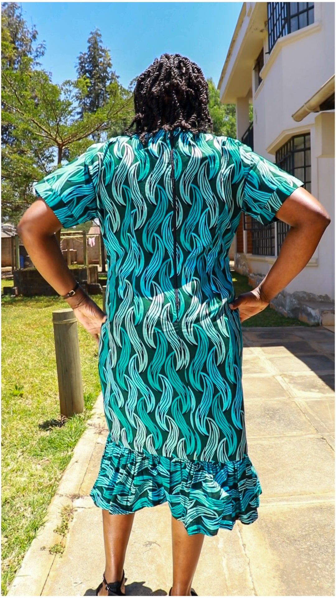 Sheath - turquoise blue, light blue and dark green leafy motif.